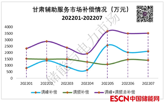 另外,甘肅省的調峰、調頻等輔助服務市場,目前的市場補償總額并不大。甘肅電力輔助服務市場運行結果顯示,2022年1-7月間,調峰輔助服務月度平均補償額為1493萬,調頻輔助服務月均平均補償為1400萬。調峰+調頻月均總補償為2893萬元。其中調頻補償目前的補償額,已是經(jīng)過了一輪調頻輔助服務市場規(guī)則調整,補償量大幅上漲后的水平(可參考文章:甘肅調頻市場8月補償額猛增,西北地區(qū)輔助服務市場可以關注)