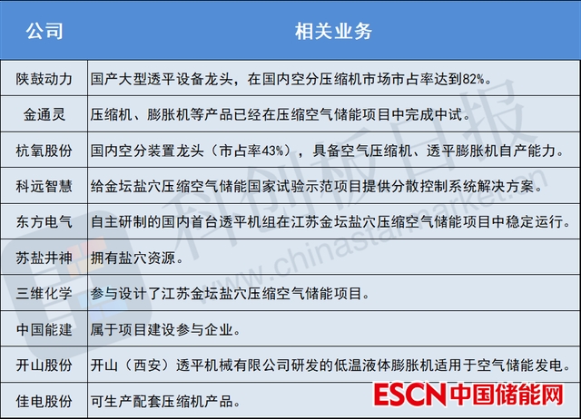 壓縮空氣儲(chǔ)能的產(chǎn)業(yè)鏈主要分為上游設(shè)備、資源供應(yīng):核心設(shè)備包括空氣壓縮機(jī)、透平膨脹機(jī)、蓄熱換熱系統(tǒng)等,此外還需要儲(chǔ)氣鹽穴資源等;中游領(lǐng)域?yàn)榧夹g(shù)提供與項(xiàng)目建設(shè);下游為電網(wǎng)系統(tǒng)。據(jù)《科創(chuàng)板日報(bào)》不完全統(tǒng)計(jì),這些A股上市公司已展開布局: