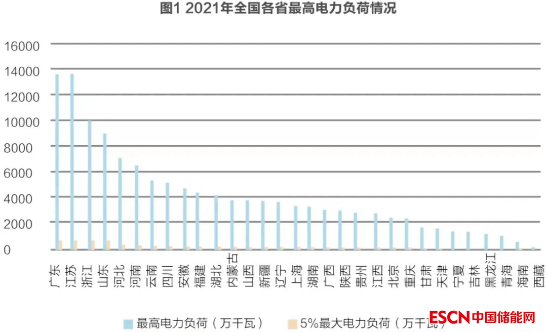 隨著可再生能源大規(guī)模接入,電網(wǎng)“雙高”、“雙峰”特性明顯,備用容量不足。極端情況下,2030年電網(wǎng)備用容量缺口將達(dá)到2億千瓦。預(yù)計(jì)“十四五”期間電網(wǎng)負(fù)荷最大日峰谷差率將達(dá)到36%,“十五五”期間將達(dá)到40%,電網(wǎng)調(diào)峰壓力持續(xù)增加。電力系統(tǒng)時(shí)段性、靈活性調(diào)節(jié)能力不足現(xiàn)象進(jìn)一步加劇,需要多措并舉提升系統(tǒng)調(diào)節(jié)能力,保障供需平衡。截至2021年底,全國(guó)最大負(fù)荷約12億千瓦,按照5%的可調(diào)節(jié)能力測(cè)算約為6000萬千瓦可調(diào)負(fù)荷能力,全國(guó)各省最大負(fù)荷及響應(yīng)能力,如下圖所示。