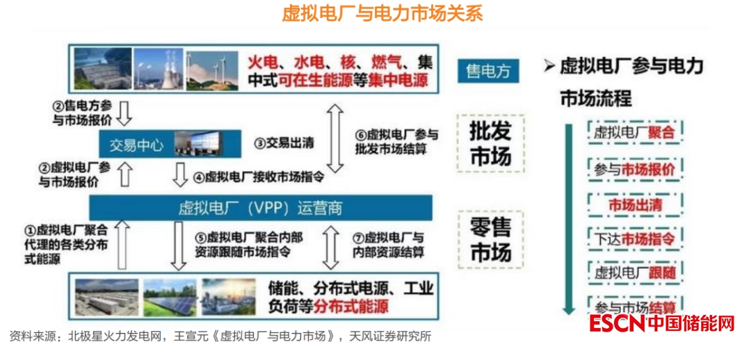 未來虛擬電廠或形成鏈接發(fā)電和用電的市場(chǎng)化閉環(huán),成為大電網(wǎng)體系外在電力市場(chǎng)中的重要參與方。虛擬電廠通過虛擬聚合、參與市場(chǎng)報(bào)價(jià)、市場(chǎng)出清、下達(dá)市場(chǎng)指令、虛擬電廠跟隨、參與市場(chǎng)結(jié)算等流程參與電力市場(chǎng)。未來若結(jié)合配電網(wǎng)、微電網(wǎng)、分布式光伏的市場(chǎng)化體系發(fā)電,有望形成大電網(wǎng)體系外的“配電”+“售電”市場(chǎng)化閉環(huán)。