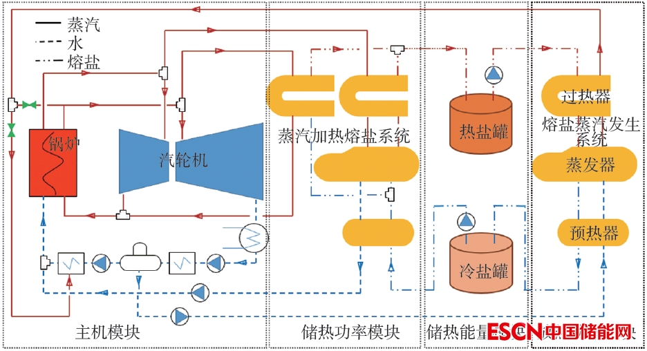 ▲嵌入高溫熔鹽儲熱系統(tǒng)的火電機組工藝圖