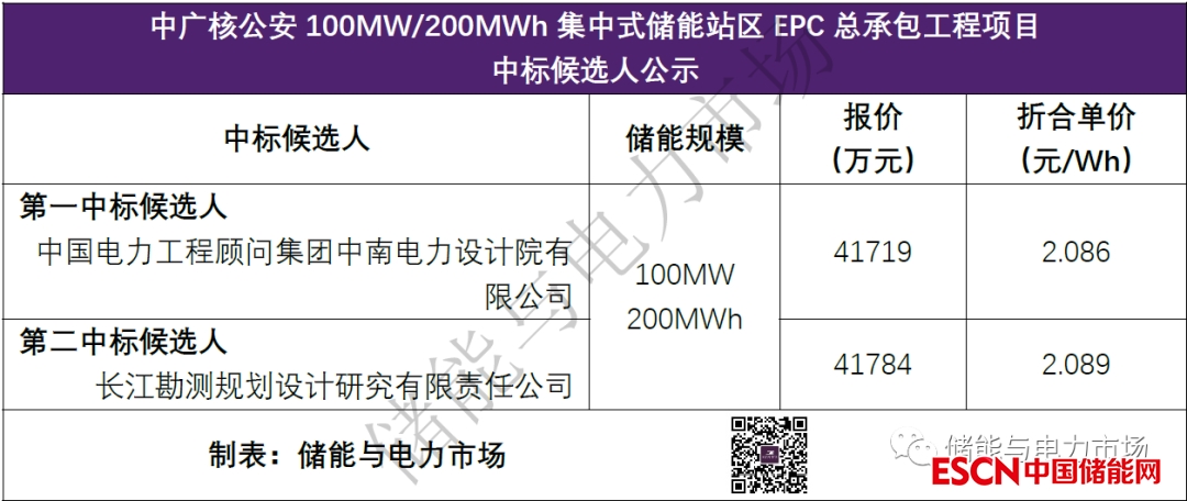 中國儲能網(wǎng)訊:10月9日中廣核公安100MW/200MWh集中式儲能站區(qū)EPC總承包工程項目中標候選人結(jié)果發(fā)布。中國電力工程顧問集團中南電力設計院有限公司以總報價41719萬元,折合單價2.086元/Wh成為第一中標候選人。中標候選人情況如下。
