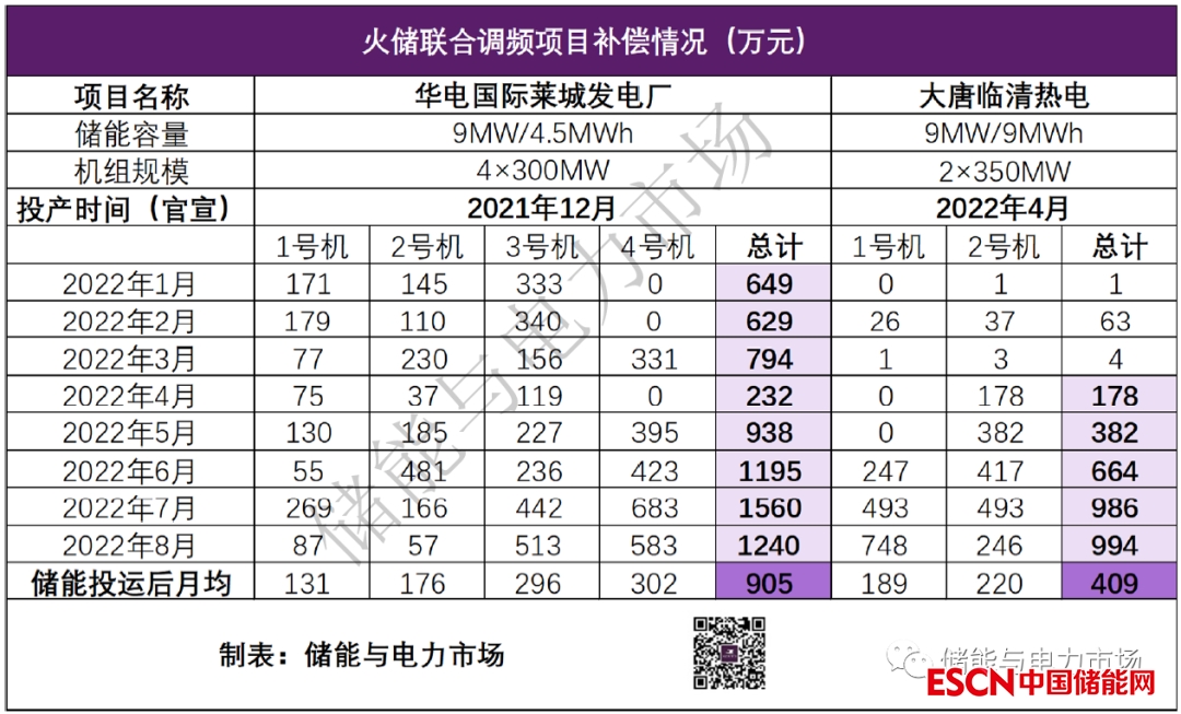 華電國際萊城發(fā)電廠2022年1-8月間,月均獲得AGC調頻輔助服務補償905萬元,3號機、4號機月均補償分別為296萬元、302萬元(儲能大概率與這兩個機組聯(lián)合運行)。