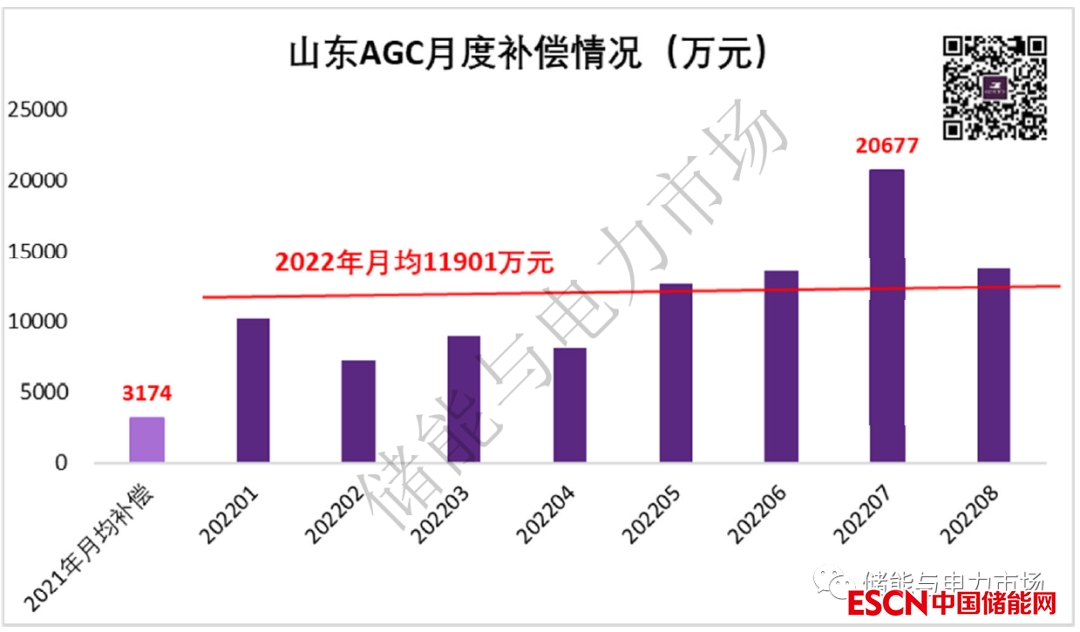 早在今年1月,山東調頻補償曾首次過億,達到了1.02億元。2022年持續(xù)的運行數(shù)據(jù)顯示,山東的AGC調頻輔助服務補償量暴漲的趨勢并非曇花一現(xiàn),1-8月間,超過5個月份補償過億,2022年7月一度高達2億元。(詳見:調頻補償超1億,現(xiàn)貨價差超1元/kWh,山東儲能想象空間很大)。
