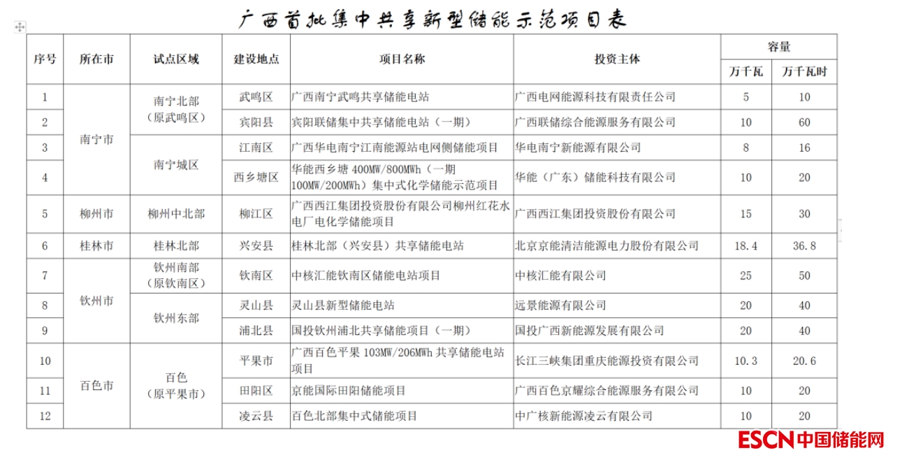 中國儲能網(wǎng)訊:9月30日,廣西壯族自治區(qū)發(fā)改委發(fā)布推進廣西集中共享新型儲能示范建設(shè)的通知。同時附件公布了廣西首批集中共享新型儲能示范項目,五市12個儲能項目總規(guī)模1.62GW/3.64GWh。投資主體分別來自廣東電網(wǎng)、華電、華能、中核、中廣核、三峽集團、京能、國投、遠景等。