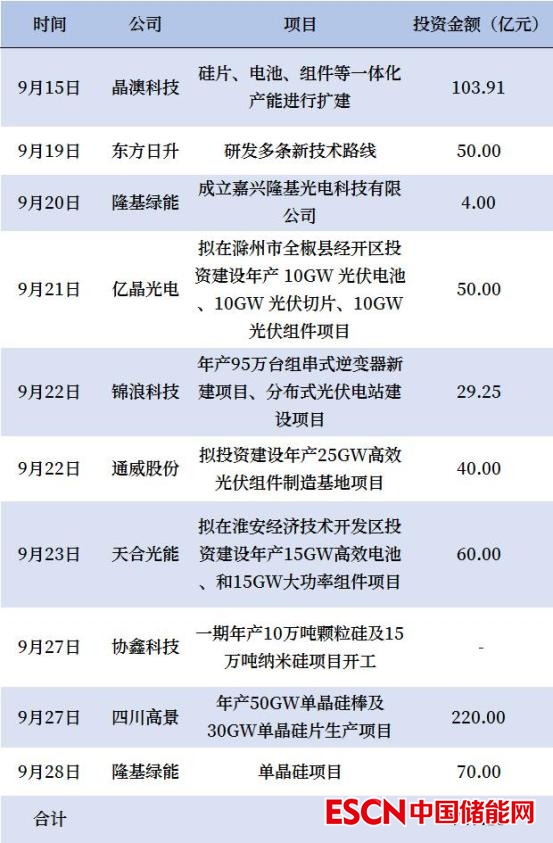 9月,多家光伏企業(yè)開辟新項目,據(jù)不完全統(tǒng)計,多家光伏企業(yè)在半個月的時間內(nèi)已經(jīng)擴(kuò)產(chǎn)近千億元的項目。