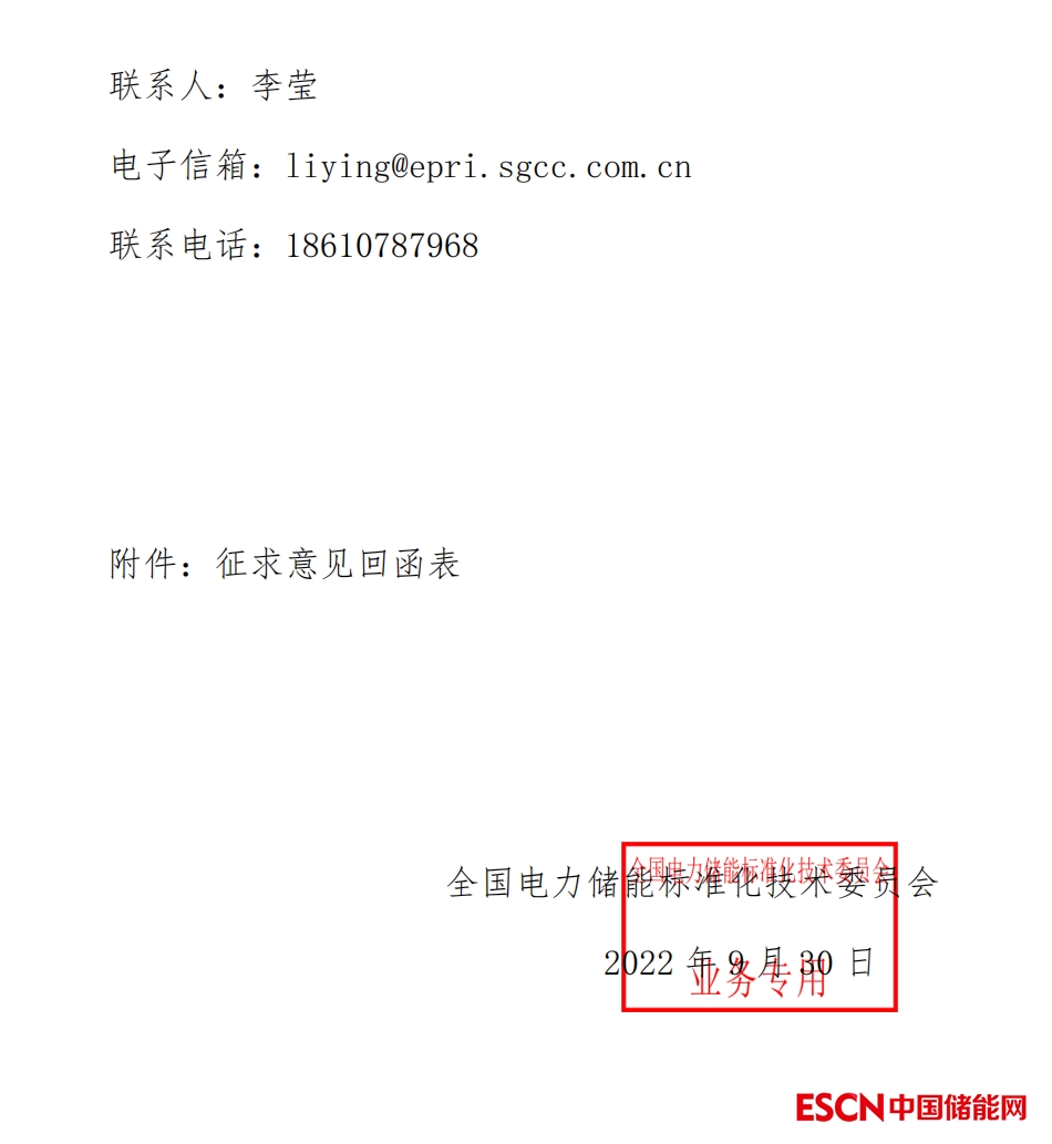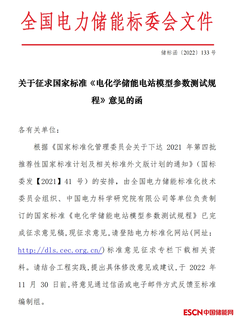 關(guān)于征求國家標(biāo)準(zhǔn)《電化學(xué)儲(chǔ)能電站模型參數(shù)測試規(guī)程》意見的函