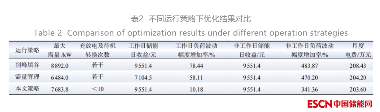 表2對(duì)比了不同運(yùn)行策略下的優(yōu)化結(jié)果,最大需量方面,本文優(yōu)化策略的最大需量介于一般削峰填谷運(yùn)行策略和需量管理運(yùn)行策略之間;SOC過(guò)程控制方面,本文優(yōu)化策略的充放電及待機(jī)狀態(tài)轉(zhuǎn)換次數(shù)大幅減少;儲(chǔ)能收益方面,本文優(yōu)化策略的儲(chǔ)能工作日收益和削峰填谷運(yùn)行策略一樣達(dá)到最大收益,比一般需量管理運(yùn)行策略收益要大,幾種不同運(yùn)行策略的非工作日儲(chǔ)能收益相同;在負(fù)荷波動(dòng)幅度增加率方面,本文優(yōu)化策略的負(fù)荷波動(dòng)幅度增加率最小,并且相比削峰填谷運(yùn)行策略和需量管理運(yùn)行策略,非工作日比工作日的負(fù)荷波動(dòng)幅度增加率降低的更多,效果更顯著;在用戶最關(guān)心的月度用電成本上,本文優(yōu)化策略的月度電費(fèi)最小。