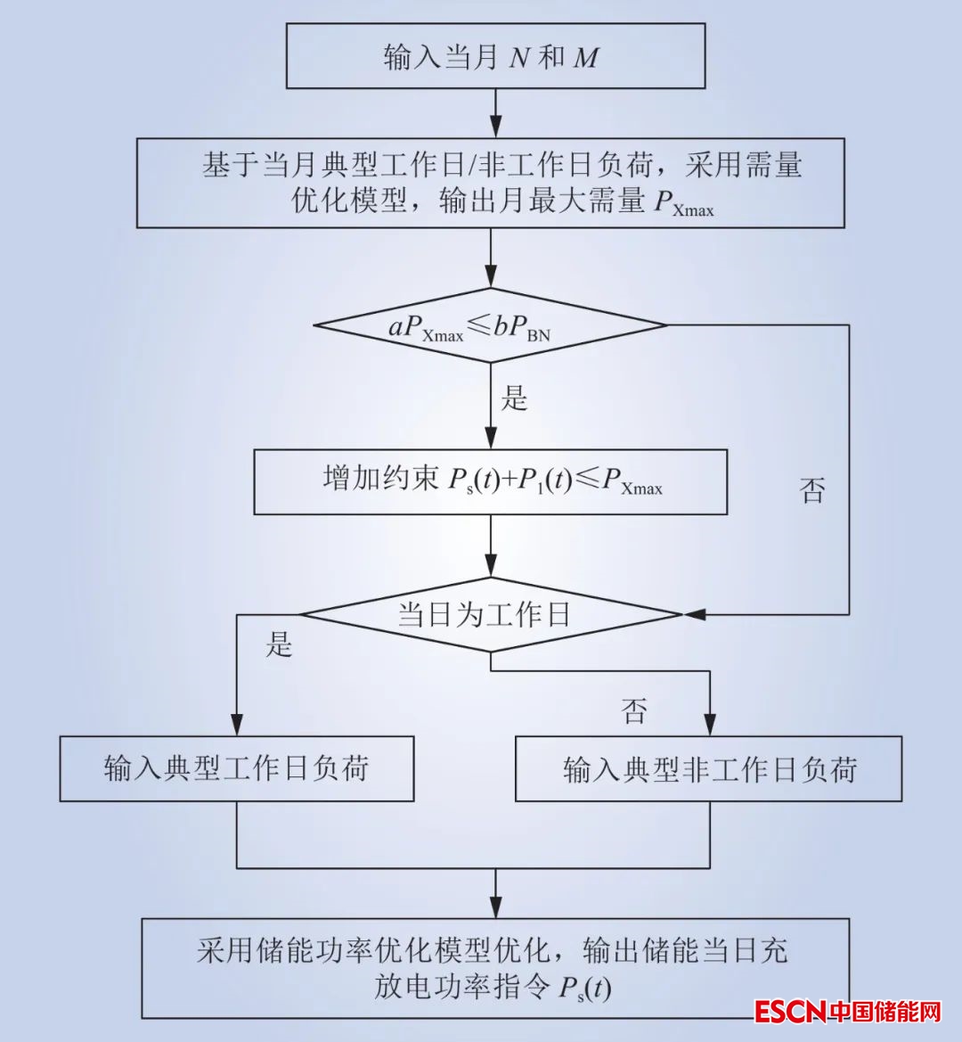 區(qū)分工作/非工作日負(fù)荷的用戶側(cè)儲(chǔ)能多目標(biāo)優(yōu)化策略主要由需量?jī)?yōu)化模型和儲(chǔ)能功率優(yōu)化模型構(gòu)成,通過(guò)需量?jī)?yōu)化模型計(jì)算出月最大需量 PXmax ,再用儲(chǔ)能功率優(yōu)化模型求得儲(chǔ)能充放電功率,主要流程如圖1所示。其中,b 為用戶變壓器容量單價(jià),元/(kW·月);PBN 為用戶變壓器容量。