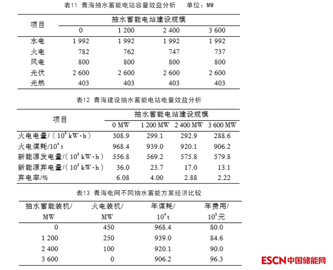 從容量效益計(jì)算結(jié)果來看,青海建設(shè)1 200 MW抽水蓄能電站可減少火電裝機(jī)規(guī)模200 MW,即抽水蓄能電站的容量效益200 MW,火電裝機(jī)替代率為16.7%;建設(shè)2 400 MW抽水蓄能電站可減少火電裝機(jī)350 MW,即抽水蓄能電站容量效益為350 MW,火電裝機(jī)替代率為14.6%;建設(shè)3 600 MW抽水蓄能電站容量效益為450 MW,火電裝機(jī)替代率為12.5%??梢钥闯?,青海電網(wǎng)抽水蓄能電站最大容量替代率僅為17%,容量效益發(fā)揮很小。