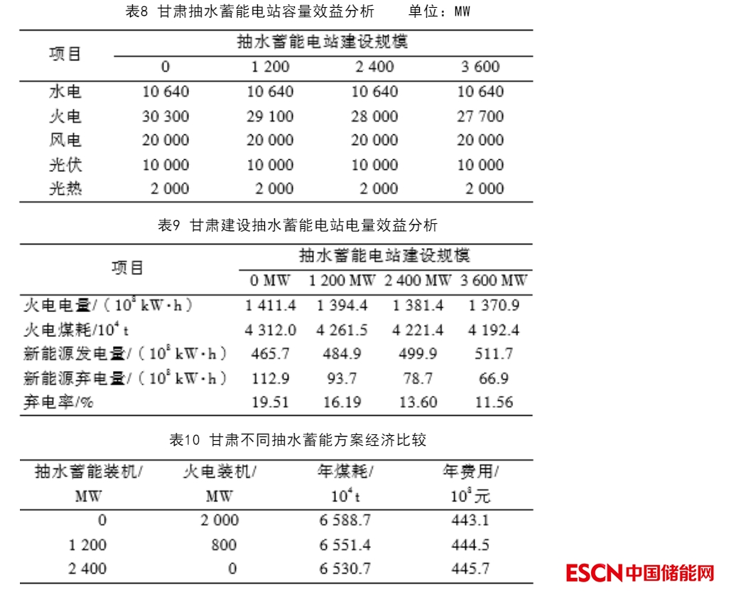 從電量效益計(jì)算結(jié)果來看:甘肅建設(shè)1 200 MW抽水蓄能電站,新能源棄電率降至16.19%,系統(tǒng)煤耗4.261 5×107t,降低煤耗0.050 5×107t;建設(shè)2 400 MW抽水蓄能電站,新能源棄電率降至13.6%,系統(tǒng)煤耗4.221 4×107 t,降低煤耗0.090 6×107 t;建設(shè)3 600 MW抽水蓄能電站,新能源棄電率降至11.56%,系統(tǒng)煤耗4.192 4×107 t,降低煤耗0.119 6×107 t。