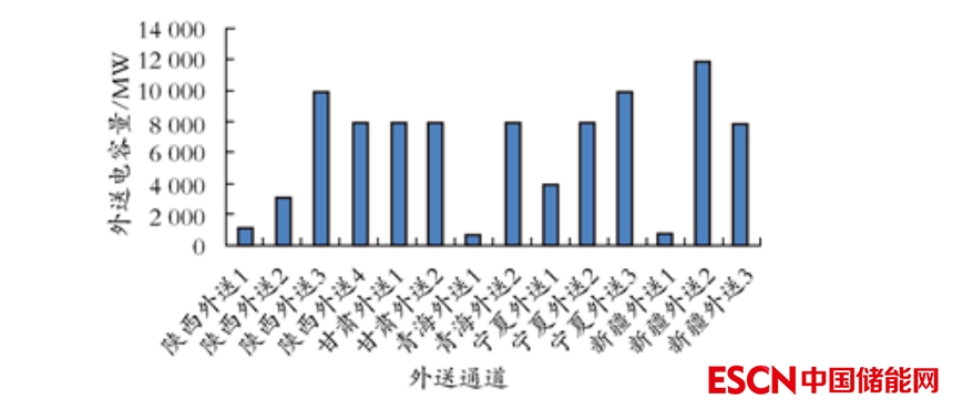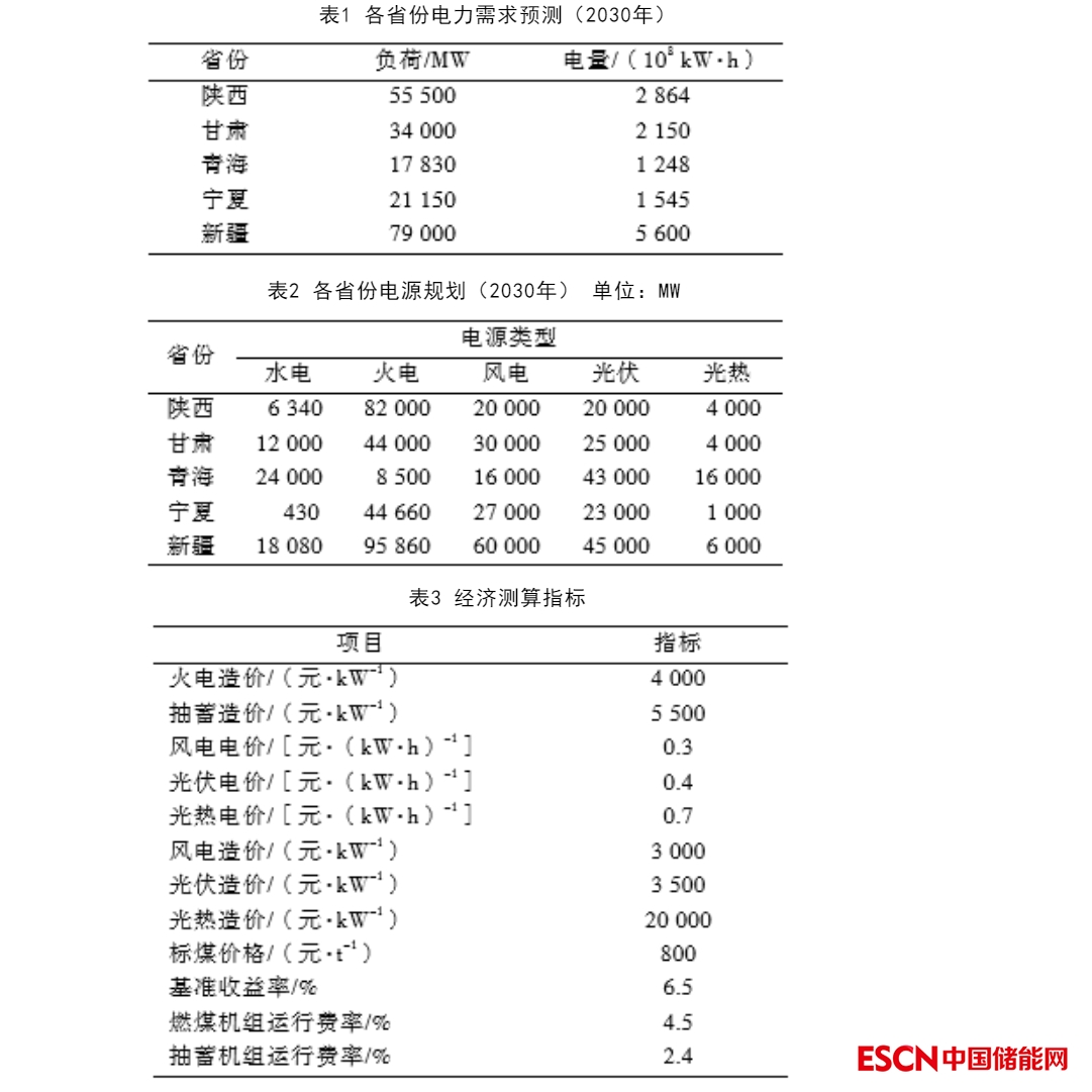考慮到抽水蓄能電站的建設(shè)周期,本文以2030年為研究水平年,根據(jù)表1、表2所示有關(guān)規(guī)劃各省份電力需求、電源規(guī)模,考慮了如圖7所示電力外送中較為確定的電力外送通道的外送電容量,采用了如表3所示的經(jīng)濟(jì)測算指標(biāo)進(jìn)行研究。與東部沿海地區(qū)抽水蓄能電站相比,西北地區(qū)建設(shè)抽水蓄能電站成本較高,本研究中西北地區(qū)抽水蓄能電站的投資水平按5 500元/kW考慮。