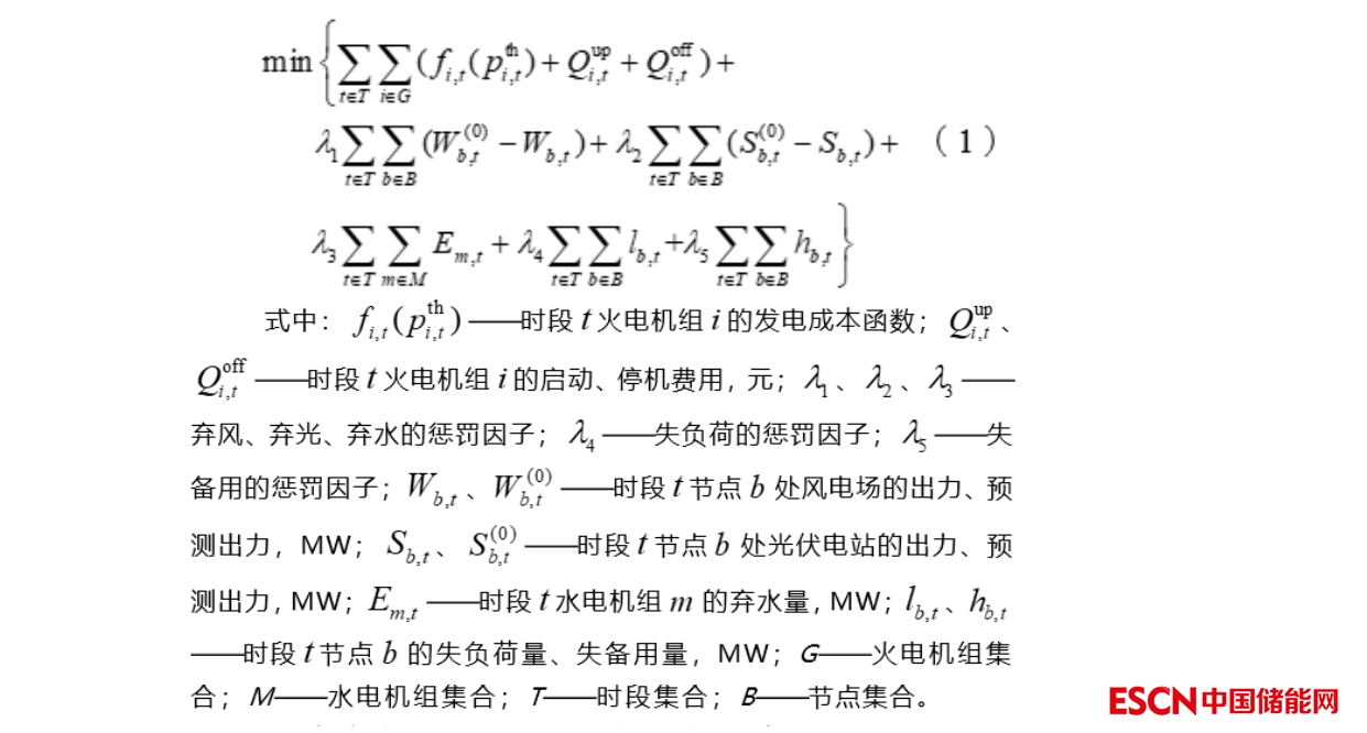 上述抽水蓄能電站效益計(jì)算中,關(guān)鍵步驟是含有抽蓄電站的生產(chǎn)模擬計(jì)算,本文采用了基于數(shù)學(xué)優(yōu)化的8 760 h全時(shí)段生產(chǎn)模擬計(jì)算模型。在滿足負(fù)荷需求的約束條件下,盡量減少新能源棄電和發(fā)電煤耗,目標(biāo)函數(shù)如下: