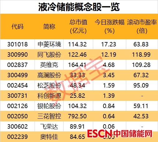 值得注意的是,今日多只液冷儲能概念股大幅上漲,申菱環(huán)境(301018)一度上漲20%;同飛股份收漲超12%,公司股價今日創(chuàng)歷史新高;英維克股價也于今日創(chuàng)出歷史新高。