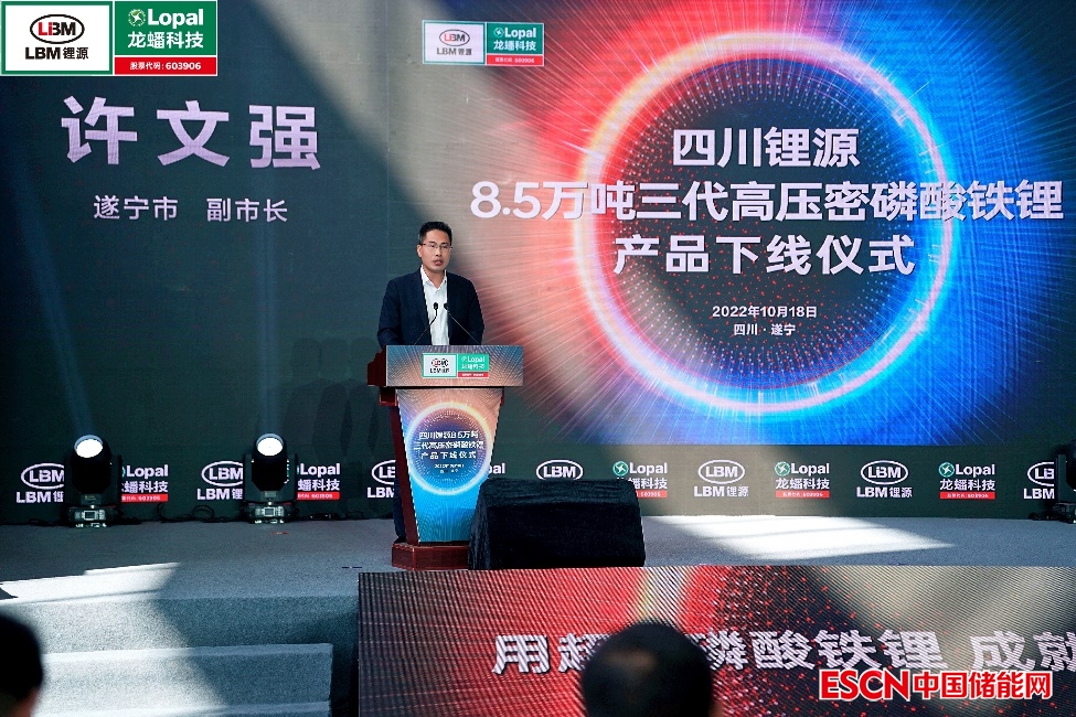 中國儲(chǔ)能網(wǎng)訊:10月18日上午,全球目前產(chǎn)能最大的三代高壓密磷酸鐵鋰生產(chǎn)線——四川鋰源新材料有限公司8.5萬噸三代高壓實(shí)密度磷酸鐵鋰產(chǎn)品下線儀式在四川遂寧隆重舉行。遂寧市副市長許文強(qiáng)、蓬溪縣委書記黃亞軍、四川鋰源母公司龍?bào)纯萍键h委書記呂振亞、四川鋰源總經(jīng)理?xiàng)钪緦捯约皝碜远嗉铱蛻艉凸?yīng)商的代表應(yīng)邀出席。
