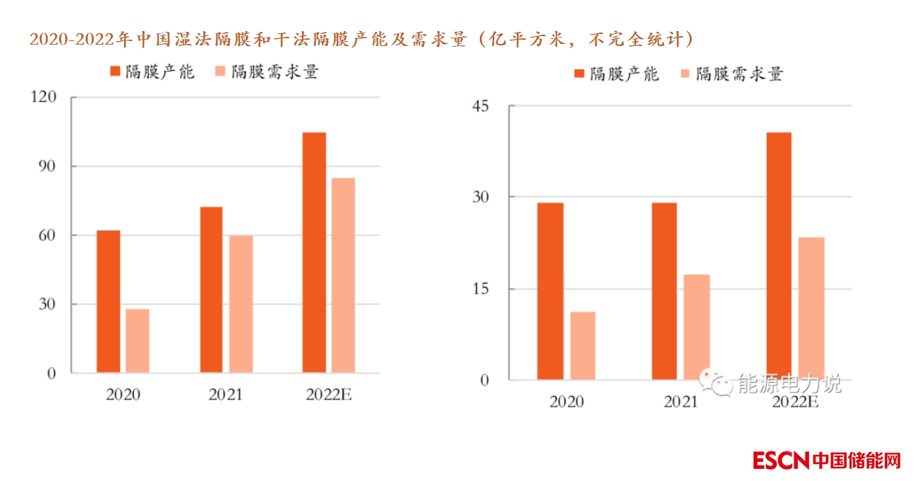 2020-2022年中國(guó)濕法隔膜和干法隔膜產(chǎn)能及需求量(億平方米,不完全統(tǒng)計(jì))