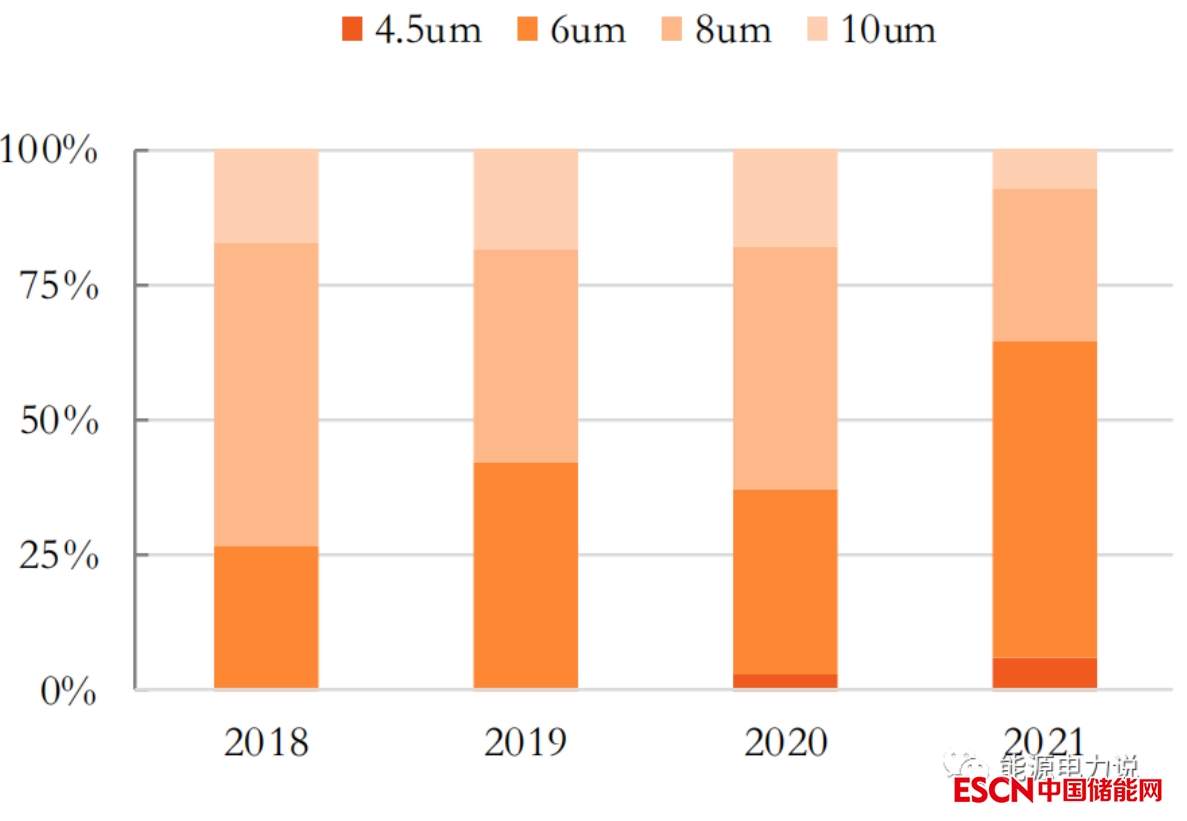 隔膜分為濕法隔膜和干法隔膜,濕法隔膜憑借輕薄、低自放電等優(yōu)勢(shì)占據(jù)市場(chǎng)主體地位。濕法隔膜厚度低于干法隔膜,有利于提升電池能量密度。干法隔膜主要優(yōu)點(diǎn)是低成本、耐過(guò)充和高安全性。