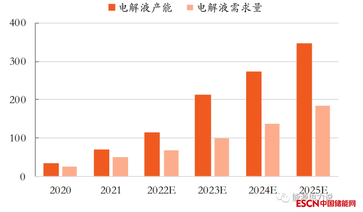 2020-2025中國(guó)電解液產(chǎn)能及需求量(萬(wàn)噸)