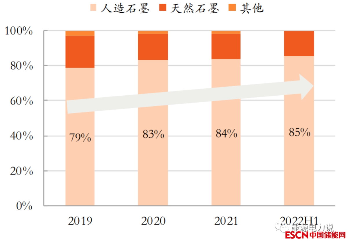 人造石墨負(fù)極是主流負(fù)極材料,占據(jù)總體市場(chǎng)80%以上市場(chǎng)份額,且市場(chǎng)占比仍在提升。