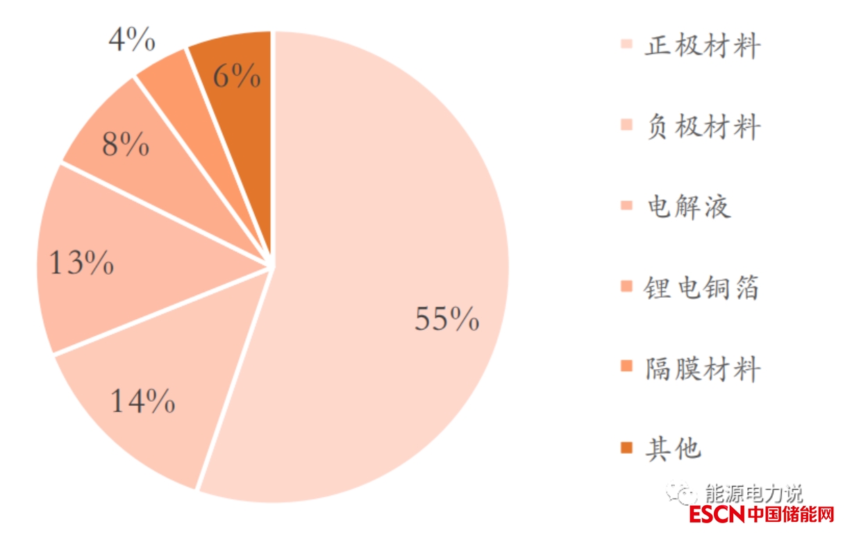 正極材料是最主要的材料成本,占比約55%。鋰離子電池主要以正極材料不同分為磷酸鐵鋰電池和三元電池,動(dòng)力電池二者均有,儲(chǔ)能電池目前國(guó)內(nèi)幾乎均為磷酸鐵鋰電池。