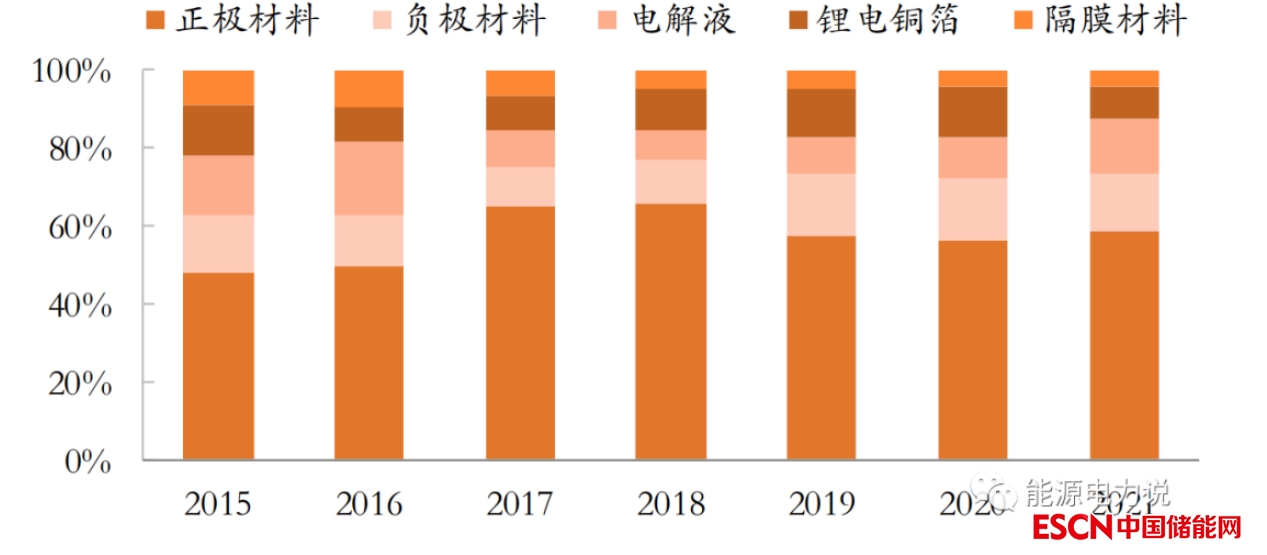 2015-2021年中國(guó)五大關(guān)鍵電池材料市場(chǎng)占比變化