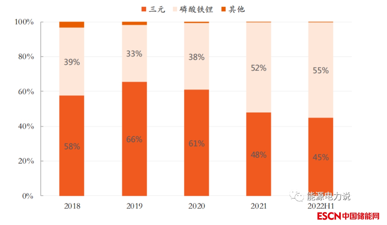 2018-2022H1年中國(guó)動(dòng)力電池產(chǎn)品結(jié)構(gòu)裝機(jī)量占比變化