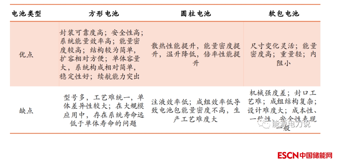 方形電池優(yōu)點(diǎn)是封裝可靠度較高、結(jié)構(gòu)簡(jiǎn)單、單體能量密度較高、系統(tǒng)成組效率較高、穩(wěn)定性相對(duì)較好,缺點(diǎn)是型號(hào)多,工藝難統(tǒng)一,單體差異性較大,使系統(tǒng)壽命低于單體壽命。