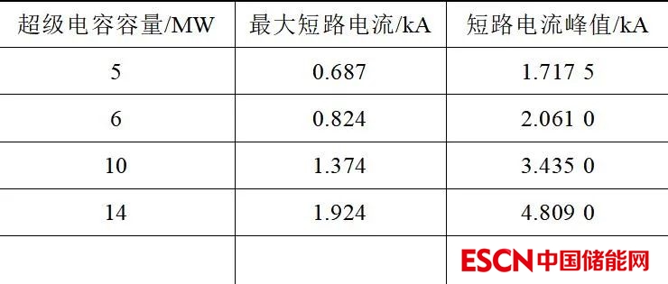 根據(jù)該項(xiàng)目超級電容儲(chǔ)能的配置情況,核算不同超級電容容量工況下的短路電流見表3。