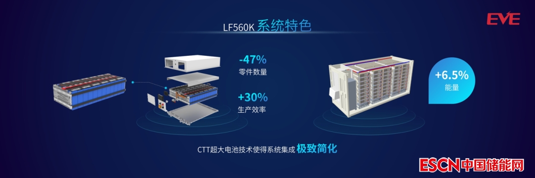 在系統(tǒng)集成的應(yīng)用中,相較于LF280K電池,使用LF560K電池可減少電芯數(shù)量50%、簡化Pack零部件數(shù)量47%,提升生產(chǎn)效率30%。此外,通過簇級別尺寸的優(yōu)化,可提高集裝箱電量6.5%,完美適配行業(yè)標準集成方案,降低客戶使用成本。