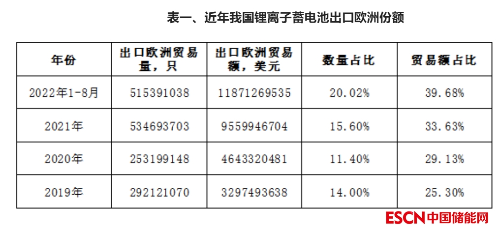 一、歐洲一直是我國(guó)鋰離子電池產(chǎn)品出口的主要目的地,2022年從貿(mào)易額上看已成為我國(guó)鋰離子電池產(chǎn)品出口的最大目的地。我國(guó)海關(guān)數(shù)據(jù)顯示,2019年–2021年,我國(guó)鋰離子蓄電池出口到歐洲的數(shù)量占出口總量的15%左右;出口額逐年增加,占比在30%左右。2022年1–8月,貿(mào)易量和貿(mào)易額占比分別提高到20%和40%,與歐洲的貿(mào)易量?jī)H次于亞洲地區(qū),貿(mào)易額則排名第一。歐洲已成為我國(guó)鋰離子電池出口的最大目的地,對(duì)我國(guó)鋰離子電池企業(yè)來(lái)說(shuō)是非常重要的市場(chǎng)。