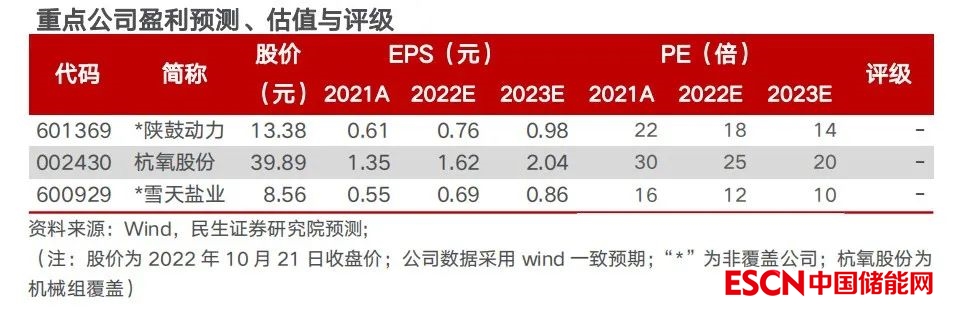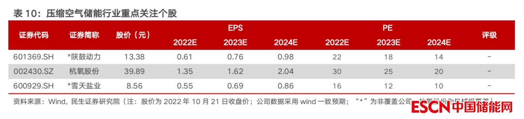 未來能源結(jié)構(gòu)中,風(fēng)光等新能源占比將不斷提升,為保證電能供應(yīng)質(zhì)量,電力系統(tǒng)對(duì)儲(chǔ)能的需求日益提升,大規(guī)模、長(zhǎng)時(shí)儲(chǔ)能需求中,壓縮空氣儲(chǔ)能綜合性能領(lǐng)先,隨政策支持釋放及產(chǎn)業(yè)鏈成本下降,裝機(jī)規(guī)模有望快速增長(zhǎng),產(chǎn)業(yè)鏈核心環(huán)節(jié)的優(yōu)質(zhì)公司有望受益。建議關(guān)注裝備制造環(huán)節(jié)的陜鼓動(dòng)力、金通靈、杭氧股份等,以及鹽穴資源領(lǐng)域的魯銀投資、蘇鹽井神、雪天鹽業(yè)等。