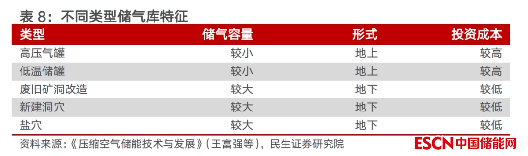現(xiàn)有壓縮空氣儲(chǔ)能項(xiàng)目主要采用地下儲(chǔ)氣庫(kù)。壓縮空氣儲(chǔ)能儲(chǔ)氣庫(kù)包括高壓氣罐、低溫儲(chǔ)罐、廢舊礦洞改造、新建洞穴、鹽穴等多種形式。其中,地上儲(chǔ)氣庫(kù)(高壓氣罐和低溫儲(chǔ)罐)目前多處于試驗(yàn)階段,成本相對(duì)較高,現(xiàn)階段在建、已投產(chǎn)項(xiàng)目多采用地下儲(chǔ)氣庫(kù)(廢舊礦洞改造、新建洞穴、鹽穴)。
