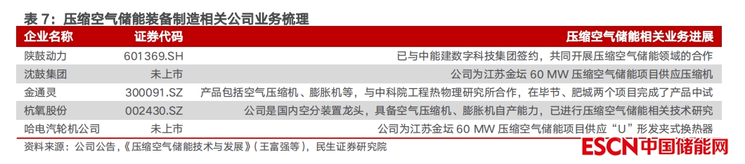 現(xiàn)有壓縮空氣儲(chǔ)能項(xiàng)目供應(yīng)商先行,傳統(tǒng)龍頭積極入局。江蘇金壇60 MW壓縮空氣儲(chǔ)能項(xiàng)目的壓縮機(jī)供應(yīng)商為沈鼓集團(tuán),換熱器供應(yīng)商為哈電汽輪機(jī)公司;張北100MW壓縮空氣儲(chǔ)能電站采用中科院研發(fā)的氣-水換熱器。除了已經(jīng)實(shí)現(xiàn)供應(yīng)的企業(yè),不少相近業(yè)務(wù)的企業(yè)也紛紛布局,例如,杭氧股份作為國(guó)內(nèi)空分裝置龍頭,具備空氣壓縮機(jī)、膨脹機(jī)自產(chǎn)能力,年初在投資者互動(dòng)中披露公司已進(jìn)行壓縮空氣儲(chǔ)能相關(guān)技術(shù)研究。