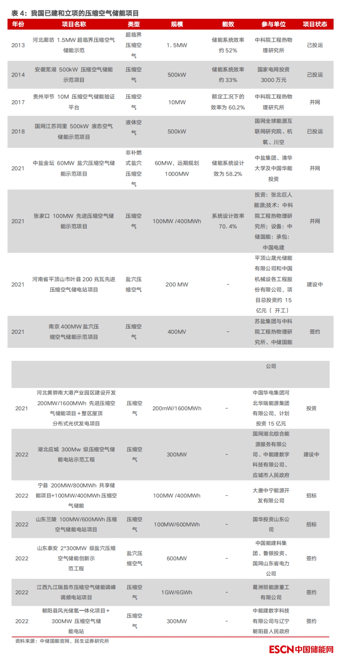 壓縮空氣儲(chǔ)能正從示范應(yīng)用向產(chǎn)業(yè)化初期邁進(jìn)。我國(guó)2022年已經(jīng)立項(xiàng)規(guī)劃規(guī)模最大的1GW壓縮空氣項(xiàng)目,為葛洲壩能源重工參與的江西九江瑞昌市調(diào)頻調(diào)峰電站項(xiàng)目。目前國(guó)內(nèi)陸續(xù)進(jìn)行了壓縮空氣、超臨界壓縮空氣、液態(tài)壓縮空氣儲(chǔ)能項(xiàng)目的研發(fā)與建設(shè)(見表4),總體研發(fā)能力已處于國(guó)際領(lǐng)先水平,雖比歐美起步晚,但發(fā)展速度較快。根據(jù)中國(guó)化學(xué)與物理電源行業(yè)協(xié)會(huì)儲(chǔ)能應(yīng)用分會(huì)發(fā)布的《2022儲(chǔ)能產(chǎn)業(yè)應(yīng)用報(bào)告》統(tǒng)計(jì)分析,2021年全球新增壓縮空氣儲(chǔ)能項(xiàng)目裝機(jī)功率共191MW,占全球儲(chǔ)能比例1.4%;而中國(guó)新增高達(dá)190MW,占中國(guó)儲(chǔ)能比例2.6%。
