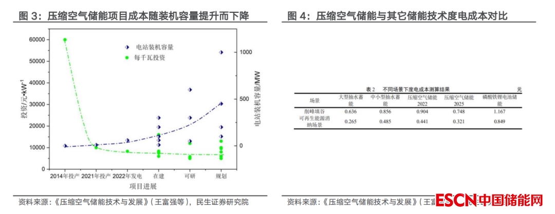 壓縮空氣儲(chǔ)能投資成本隨裝機(jī)容量提升而下降。2014年,國(guó)內(nèi)首個(gè)投運(yùn)的壓縮空氣示范項(xiàng)目蕪湖500kW電站,單位投資成本約6萬(wàn)元/kW;2021年投運(yùn)的肥城一期10MW電站,單位投資成本已降至1萬(wàn)元/kW。根據(jù)《壓縮空氣儲(chǔ)能技術(shù)與發(fā)展》報(bào)告中統(tǒng)計(jì),針對(duì)部分可研階段和規(guī)劃階段的壓縮空氣儲(chǔ)能項(xiàng)目,預(yù)計(jì)未來投資成本可降至0.5~0.6萬(wàn)元/kW,與大型抽水蓄能電站相當(dāng)。