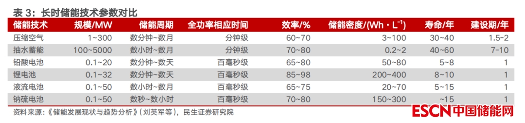 隨著新能源發(fā)電比例提升,容量型儲(chǔ)能需求快速增長(zhǎng)。以風(fēng)電、光伏為代表的可再生能源在分鐘、小時(shí)、連續(xù)數(shù)天甚至跨季節(jié)等不同時(shí)間尺度上具有波動(dòng)性和間歇性的特點(diǎn),因此需要匹配不同時(shí)長(zhǎng)的儲(chǔ)能技術(shù)。目前新能源側(cè)配置儲(chǔ)能系統(tǒng)通常以功率型或能量型為主,主要起到平滑功率波動(dòng)的作用。隨著新能源裝機(jī)規(guī)??焖僭鲩L(zhǎng),其在發(fā)電結(jié)構(gòu)中占比提升,對(duì)儲(chǔ)能時(shí)長(zhǎng)的要求越來越高,容量型儲(chǔ)能的需求日益增長(zhǎng)。