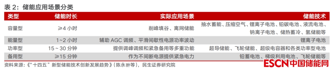 不同應(yīng)用場(chǎng)景對(duì)儲(chǔ)能技術(shù)的性能要求有所不同。根據(jù)儲(chǔ)能應(yīng)用場(chǎng)景的時(shí)長(zhǎng)要求,可以分為容量型、能量型、功率型、備用型。其中,容量型儲(chǔ)能屬于長(zhǎng)時(shí)儲(chǔ)能技術(shù),一般要求儲(chǔ)能時(shí)長(zhǎng)不低于4小時(shí),應(yīng)用于削峰填谷或離網(wǎng)儲(chǔ)能等場(chǎng)景,主要目的是減小峰谷差、提升電力系統(tǒng)效率和設(shè)備利用率、降低新發(fā)電機(jī)組和輸電線路的建設(shè)需求。