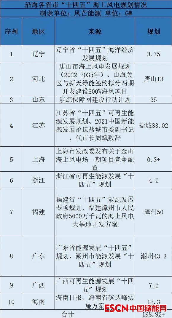 中國(guó)儲(chǔ)能網(wǎng)訊:根據(jù)公開(kāi)信息不完全統(tǒng)計(jì),目前已出爐的沿海省市海上風(fēng)電規(guī)劃接近200GW。