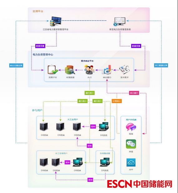需求響應的啟動、溝通、執(zhí)行和效果評估等各環(huán)節(jié)均需要數(shù)據(jù)和技術平臺的支撐,整個響應過程涉及國家(?。╇娏π枨髠裙芾砥脚_、新型電力負荷管理系統(tǒng)、需求響應平臺、負荷集成商電能管理系統(tǒng)以及電力用戶電能管理系統(tǒng)(或需求響應系統(tǒng)等)等,其實施系統(tǒng)基本架構如下圖: