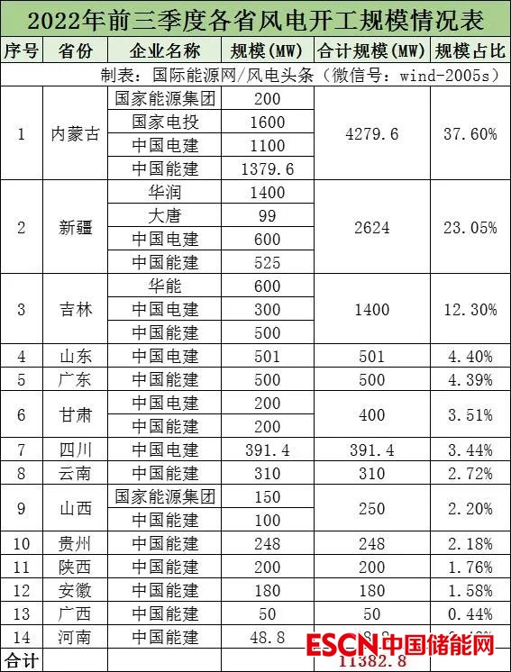 國際能源網(wǎng)/風(fēng)電頭條(微信號:wind-2005s)通過梳理,2022年前三季度開工風(fēng)電項(xiàng)目規(guī)模累計(jì)11382.8MW,其中內(nèi)蒙古開工風(fēng)電項(xiàng)目位列第一,規(guī)模達(dá)4279.6MW,新疆位列第二,規(guī)模為2624MW,吉林省位列第三,規(guī)模為1400MW。