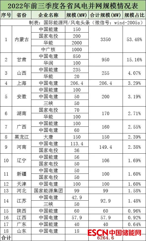 國際能源網(wǎng)/風(fēng)電頭條(微信號:wind-2005s)通過梳理,2022年前三季度并網(wǎng)風(fēng)電項(xiàng)目規(guī)模累計(jì)6264.6MW,其中內(nèi)蒙古并網(wǎng)風(fēng)電項(xiàng)目位列第一,規(guī)模達(dá)3350MW,甘肅省位列第二,規(guī)模為950MW,山西省位列第三,規(guī)模為255MW。