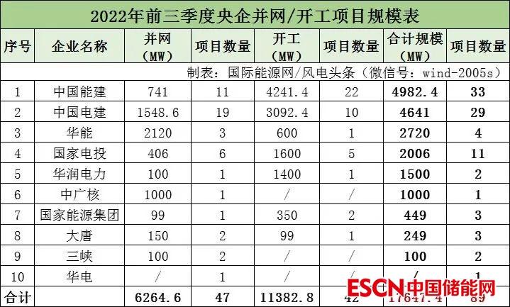 國際能源網(wǎng)/風(fēng)電頭條(微信號:wind-2005s)梳理發(fā)現(xiàn),根據(jù)統(tǒng)計(jì),2022年前三季度并網(wǎng)及開工風(fēng)電項(xiàng)目規(guī)模超2GW的央企有中國能建、中國電建、華能、國家電投。并網(wǎng)及開工項(xiàng)目位列第一的央企是中國能建,裝機(jī)累計(jì)達(dá)4982.4MW,其次是中國電建,裝機(jī)達(dá)4641MW。