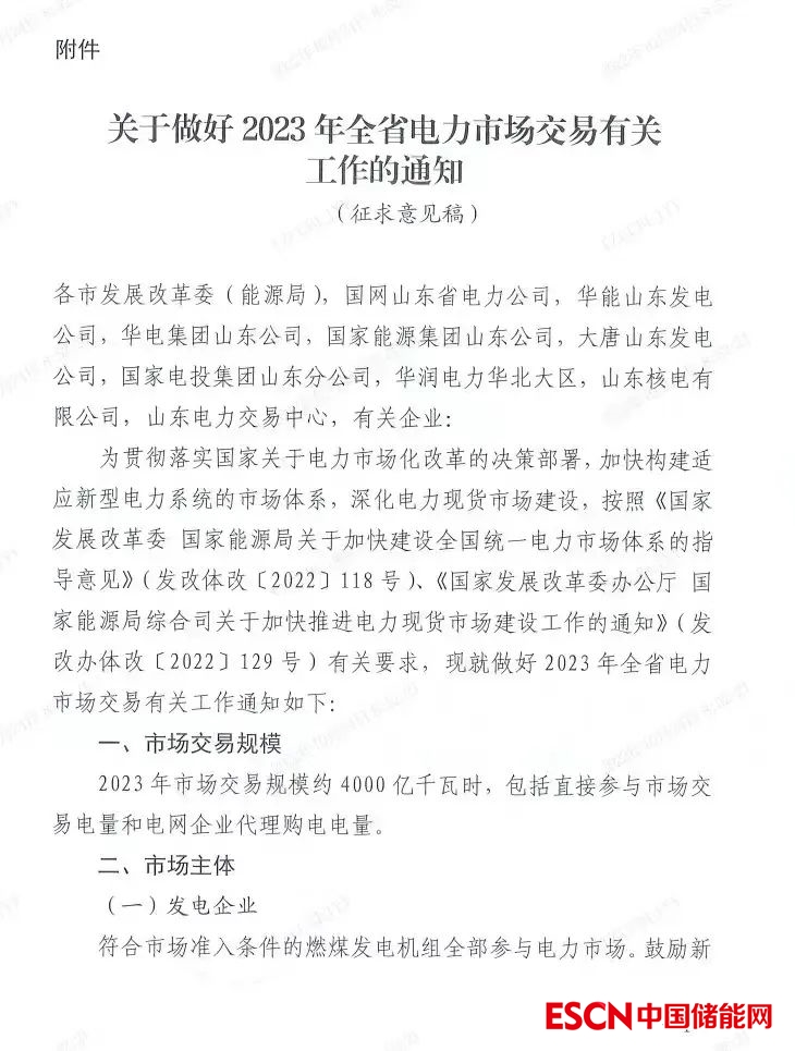 中國儲能網(wǎng)訊:10月20日,山東省能源局發(fā)布《關(guān)于征求2023年全省電力市場交易有關(guān)工作意見的通知》。