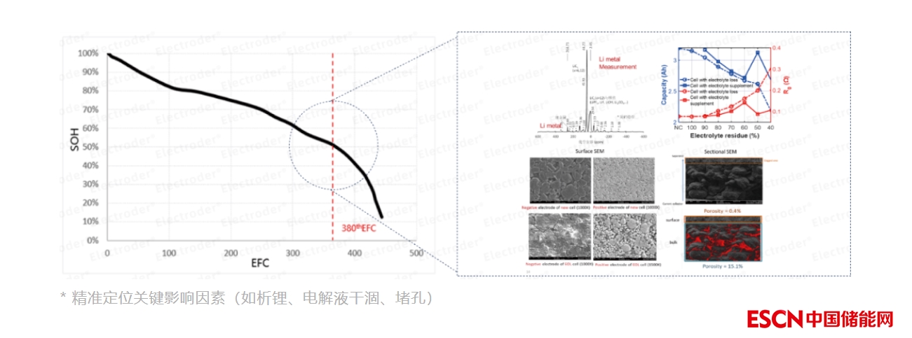 例如,電池壽命后期突然發(fā)生的容量跳水、電池負極表面析鋰及帶來的電解液的耗干等,而這些現(xiàn)象對于迅速捕捉電池容量的陡峭變化及時更新BMS算法、在線故障診斷、預防電池安全事故等,以及可能的梯次利用場景等,都具有重要價值。