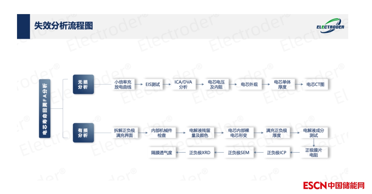 無損分析包括小倍率重放電曲線、EIS測試、電芯ICA/DVA測試、電芯電壓及內(nèi)阻、電芯外觀、電芯尺寸、電芯CT圖等環(huán)節(jié)。有損分析包括電極滿充界面、電芯機械件檢查、電解液殘留量及顏色、內(nèi)部卷芯形變確認、陰陽極厚度測量、電解液成分、正負極EDS等環(huán)節(jié)。