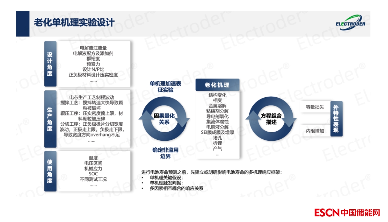 易來科得的方案通過采用“雙軌并行”的模式,從設計、生產(chǎn)、使用角度出發(fā),準確映射到相應老化機理,進而歸因至電池壽命衰減的兩大主要外特性表現(xiàn)——容量損失及內(nèi)阻增加,以科學的機理+工程方法明晰影響電芯壽命的復雜響應機制。