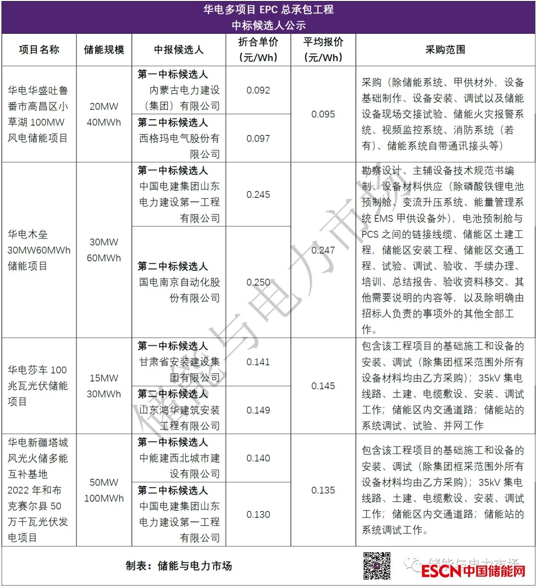 中國儲能網(wǎng)訊:近日華電新疆多個項目發(fā)布了EPC工程中標公告(不包含儲能設(shè)備采購),中標平均價位于0.095-0.247元/Wh之間。如下表所示。