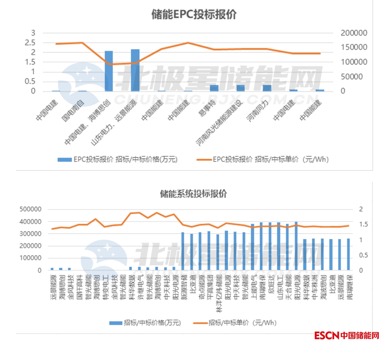中標價格方面,儲能系統(tǒng)采購類的投標報價區(qū)間在1.36~1.89元/Wh,儲能EPC的投標報價區(qū)間在1.39~2.51元/Wh之間。中標單位方面,中國能建、中國電建(601669)、科華數(shù)據(jù)出現(xiàn)率最高,另外在投標單位方面,海博思創(chuàng)、智光儲能表現(xiàn)活躍,分別參與4個項目采購開標。