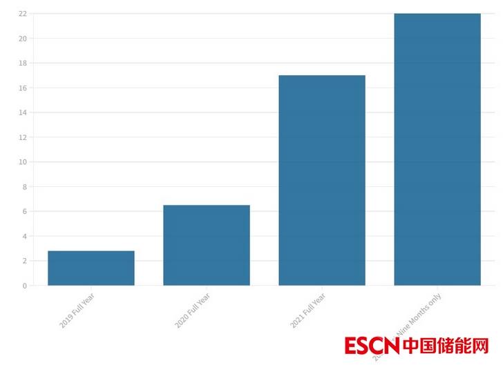 該集團最新發(fā)布的季度報告追蹤了儲能行業(yè)的企業(yè)、風投資金和并購活動。調(diào)查發(fā)現(xiàn),從今年1月到9月,成交的92宗交易共獲得220億美元融資。2021年全年總額為170億美元,而到去年前三個季度,這一數(shù)字為130億美元。