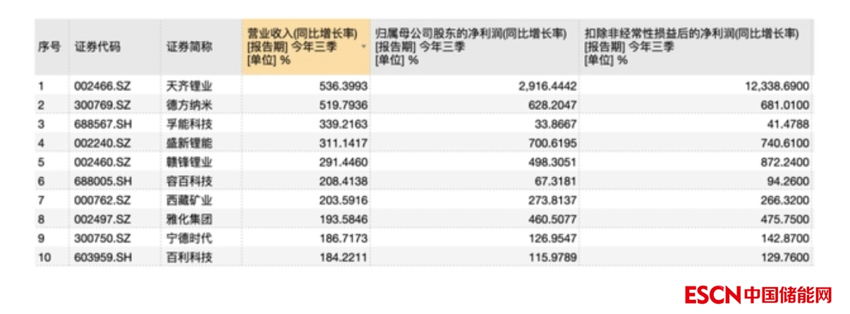 而從單家公司來(lái)看,寧德時(shí)代與比亞迪當(dāng)之無(wú)愧成為“明星公司”。鹽湖股份則憑借高達(dá)76.96%的凈資產(chǎn)收益率位列第一名,成為“最會(huì)賺錢(qián)的公司”。而“最佳進(jìn)步獎(jiǎng)”應(yīng)該頒發(fā)給天齊鋰業(yè)——公司前三季度實(shí)現(xiàn)了營(yíng)業(yè)收入5倍、歸母凈利潤(rùn)29倍、扣非凈利潤(rùn)123倍的“逆天”同比漲幅。